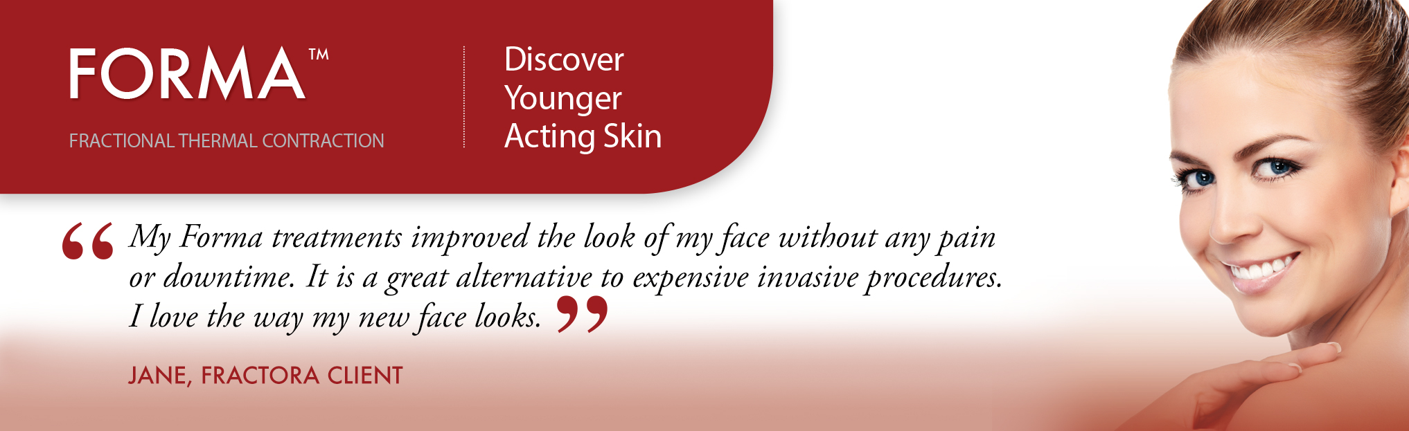 Visible results can be seen immediately, but typically after two weeks the most noticeable results will appear. Improvements continue up to three months after treatment. FORMA will improve many of the visible signs of aging such as wrinkles, as well as deeper skin laxity ; however, with the passage of time and with environmental exposure, skin ages as we do. If you are exposed to a lot of sun and do not use sunscreen, the underlying issues will return sooner. We encourage our clients and provide directions to follow an effective preventative skin care regime and keep it protected from the sun, so that the skin will continue to look younger and healthier. Quality sunscreen, hats and sunglasses are excellent protection for overall skin health.