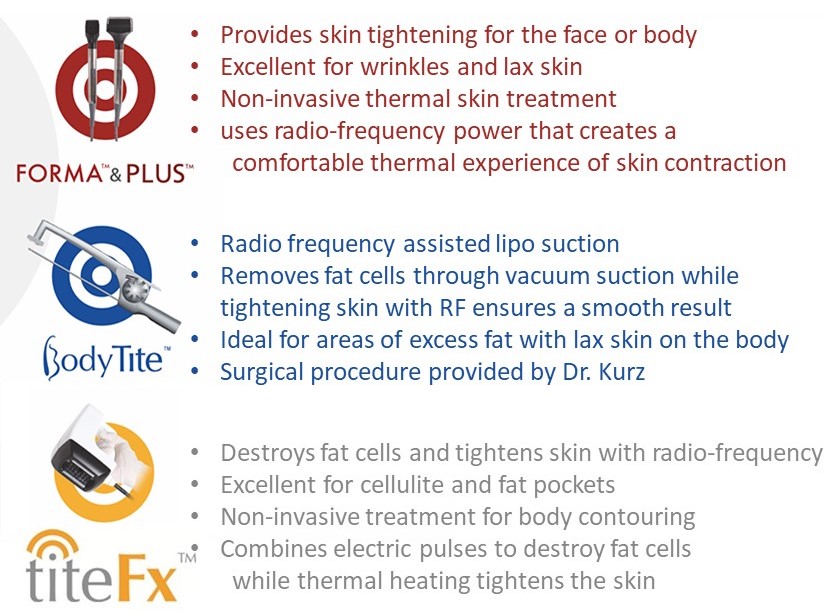 Excellent results are also dependent on client compliance and lifestyle factors such as diet and exercise. It is important to note that the FORMA treatment does not remove fat cells, but tightens lax skin for a more toned and defined appearance. Our clinic also offers TiteFx for non-invasive body contouring along with fat cell destruction, or BodyTite Radio-Frequency Assisted Liposuction for even more dramatic results. For more information regarding body contouring with liposuction, read this informative article by clicking here.